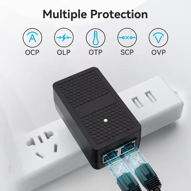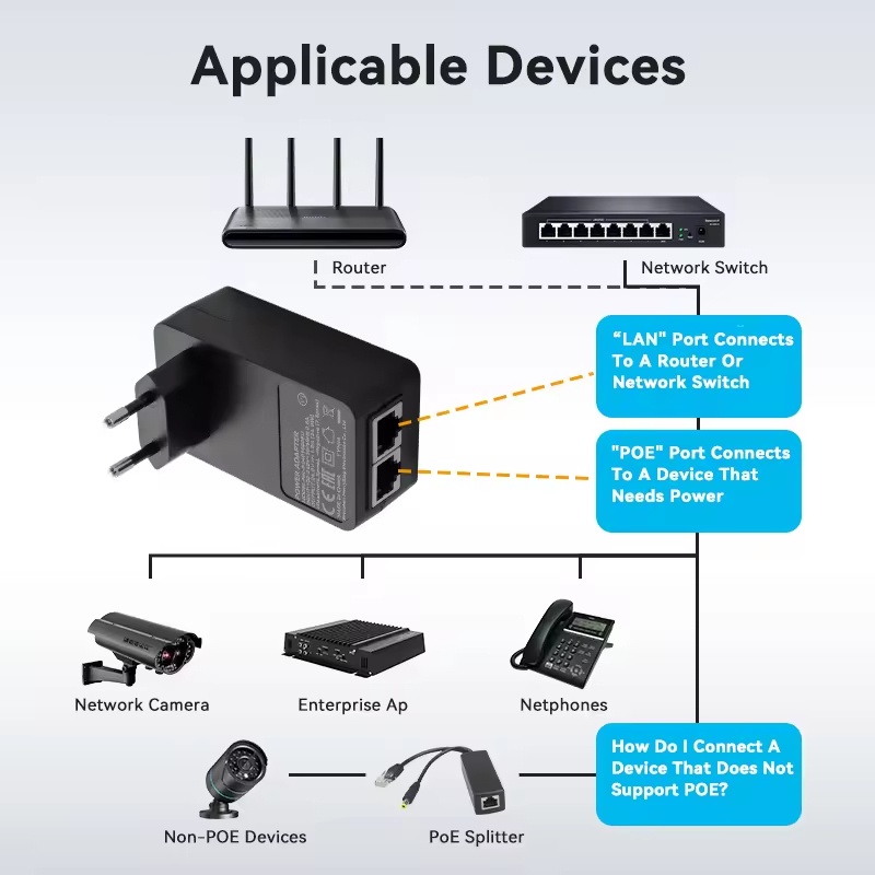 1.Remotely power PoE Device Thru CAT.5,6,7 Cable up to 328.1 feet(100 meters)